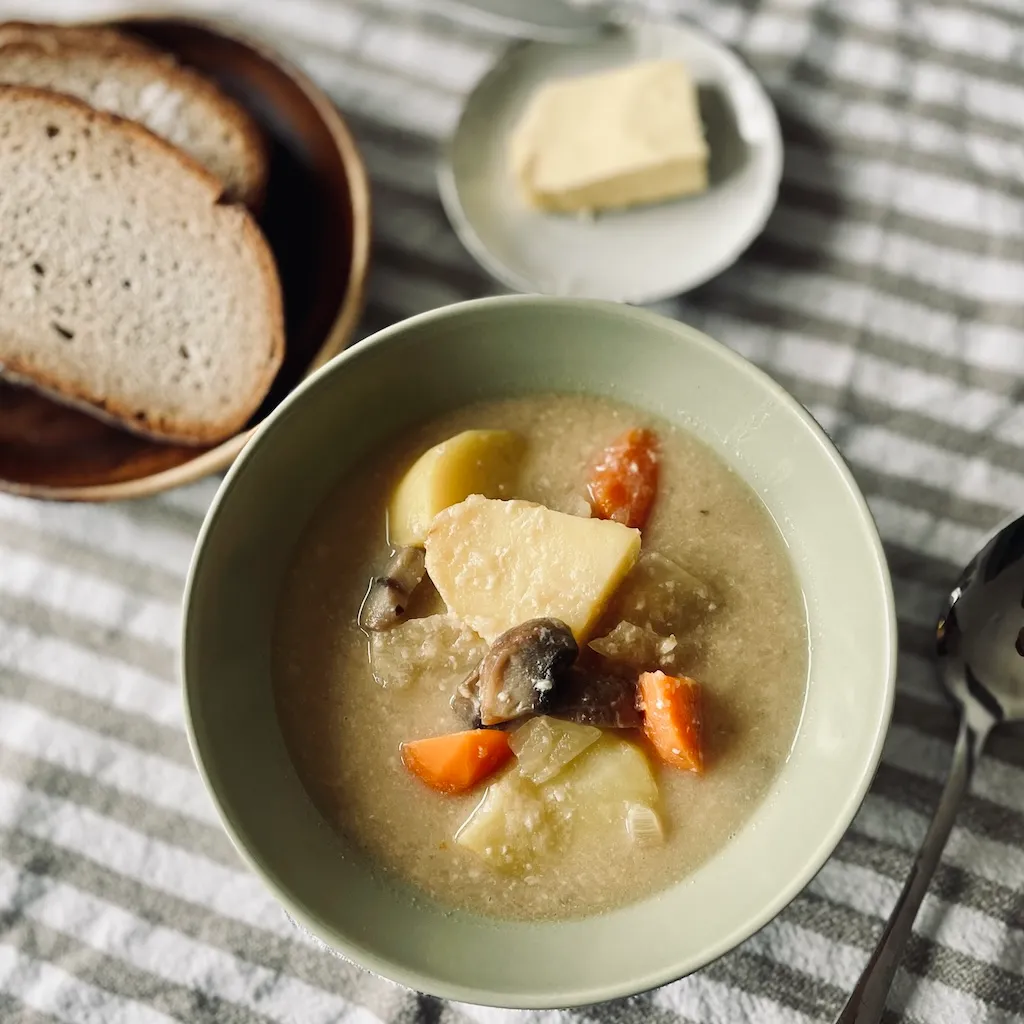 クリームシチューというと小麦粉とバターを炒めて、、、と少し手間がかかるような気がしますが、このレシピは味噌汁の作り方とほぼ一緒です。ベジタリアンではないですが、個人的な好みで豆乳(またはハーファーミルク)を使っています。玉ねぎ麹は、市販の野菜コンソメなどでも代用可能です。