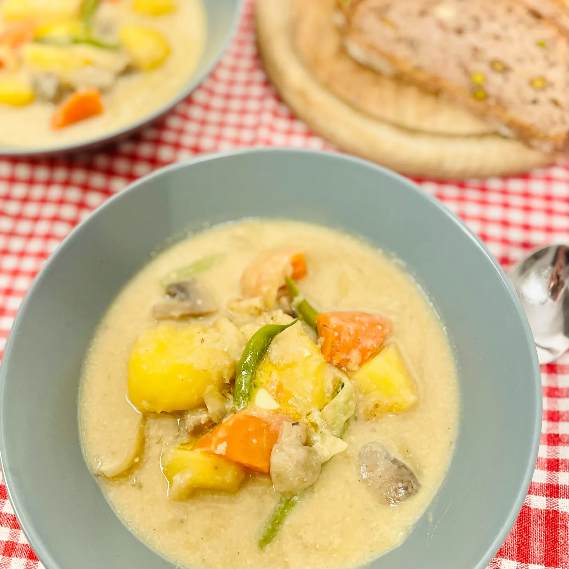 ⑸ Wenn die Kartoffeln und Karotten gekocht sind, Sojamilch (oder Hafermilch) und Zwiebelkoji (oder Gemüsebrühe) hinzufügen.